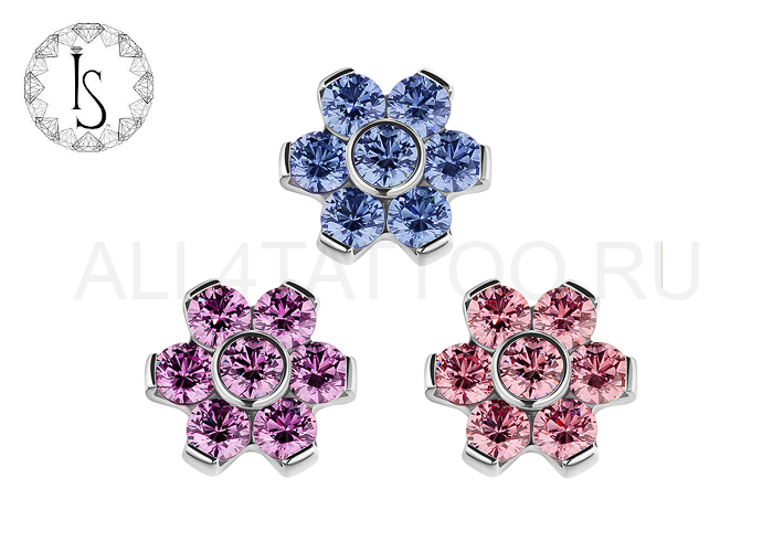 Накрутка для микродермала из имплантационного титана ASTM F-136 ( Ti-6Al-4V ELI ) в форме цветка диаметром 6 мм с кристаллами SWAROVSKI ZIRCONIA, отполированы вручную от американской компании Industrial Strength. Подходит для микродермалов и украшений толщиной 1,6мм с внутренней резьбой.