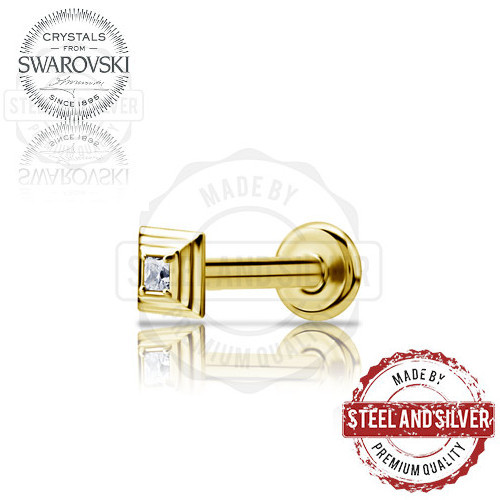 Лабрет с внутренней резьбой из хирургической стали 316L и PVD покрытием 24х каратного золота. Накрутка размерами 5,5х2мм украшена кристаллом Swarovski.