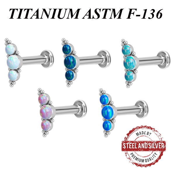 Лабрет из имплантационного титана 6Al-4V-Eli ASTM: F-136 с внутренней резьбой. Украшен кластером с искусственными опалами.