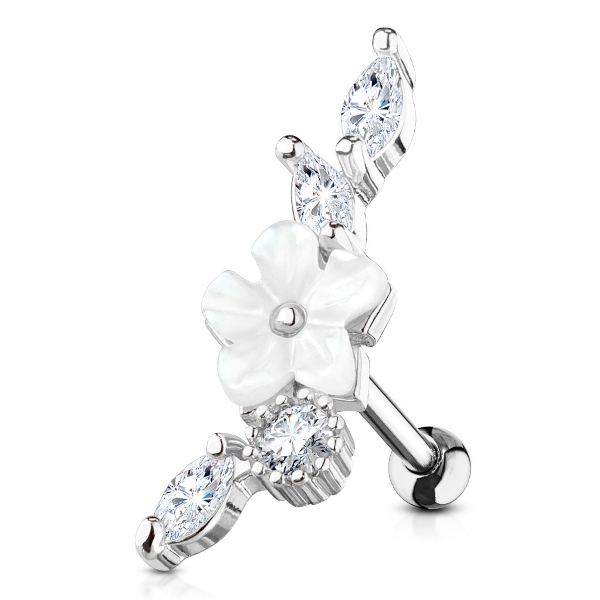 Микроштанга из хирургической стали 316L с декоративной частью из родированной латуни. Украшена комбинацией стразов и резного цветка из перламутра.