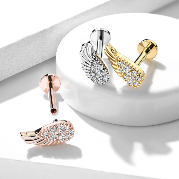 Лабрет с внутренней резьбой из хирургической стали 316L и накрутки из латуни с родированием. Украшен стразами. Размер декоративной части - 5х10мм. Представлена также вариация с золотым IP покрытием.