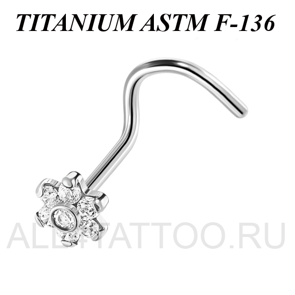 Нострил из имплантационного титана 6Al-4V-Eli ASTM: F-136 с цветком украшенным фианитами. Диаметр цветка 4мм.