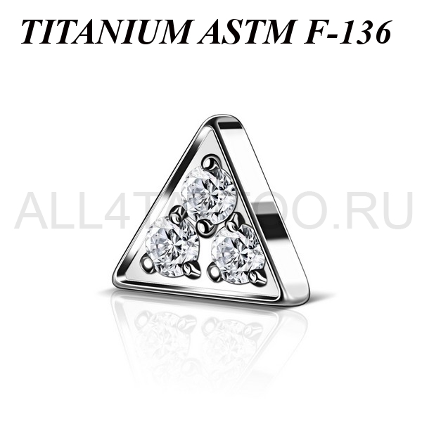 Накрутка из имплантационного титана 6Al-4V-Eli ASTM: F-136 в форме треугольника, украшенного тремя прозрачными фианитами. Подходит для украшений с внутренней резьбой толщиной 1 и 1,2 мм.