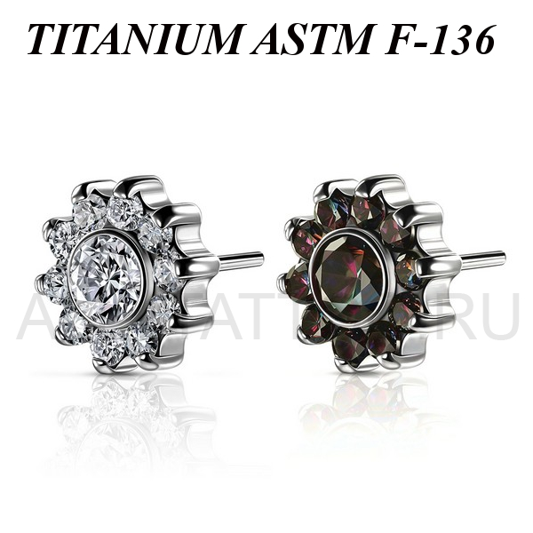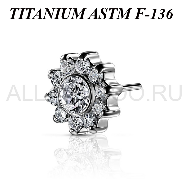Вставка из имплантационного титана 6Al-4V-Eli ASTM: F-136 для безрезьбовых украшений. Декоративная часть в форме цветка, украшенного фианитами.