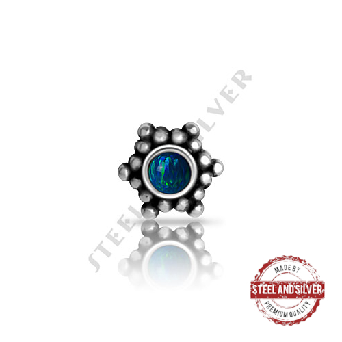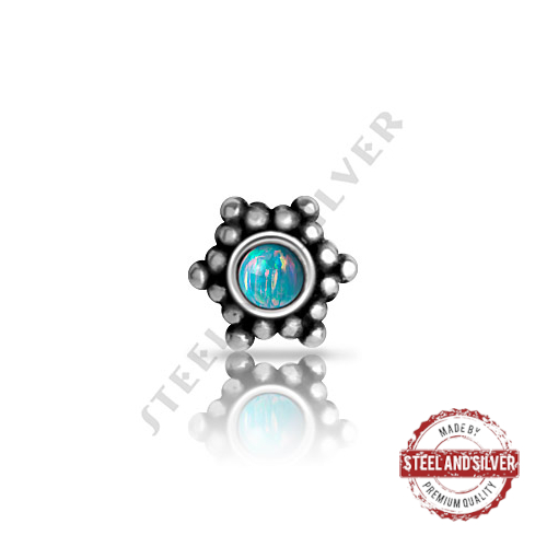 Накрутка из хирургической стали 316L для украшений с внутренней резьбой и микродермалов. Накрутка украшена лабораторными опалами. Подходит для украшений толщиной 1 и 1,2 мм с диаметром резьбы 0.8мм. Диаметр накрутки: 4мм.