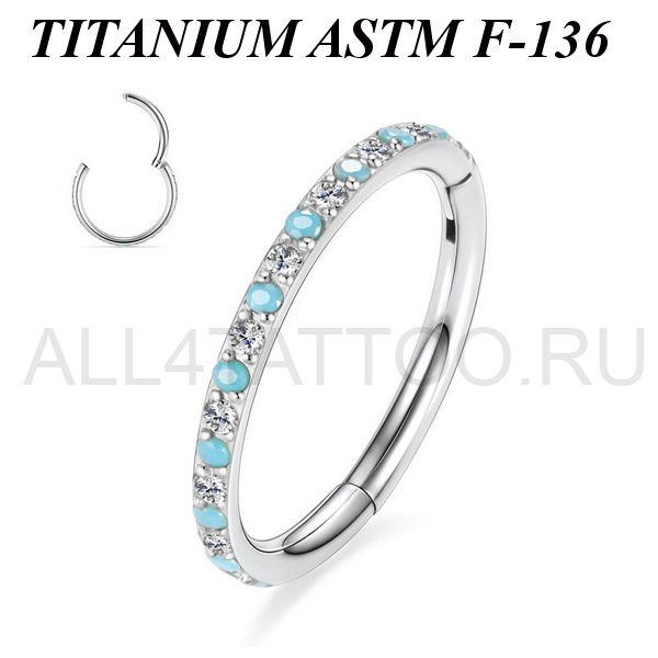 Изящный кликер из имплантационного титана 6Al-4V-Eli ASTM: F-136. Украшен сетом из прозрачных фианитов и искусственной бирюзы.