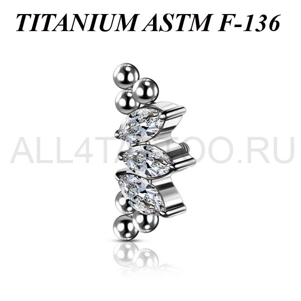 Кластер из имплантационного титана 6Al-4V-Eli ASTM: F-136. Украшен прозрачными фианитами огранки "маркиз". Размер декоративной части 8,5х4,5мм. Подходит для украшений с внутренней резьбой толщиной 1 и 1,2 мм.