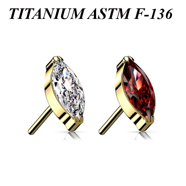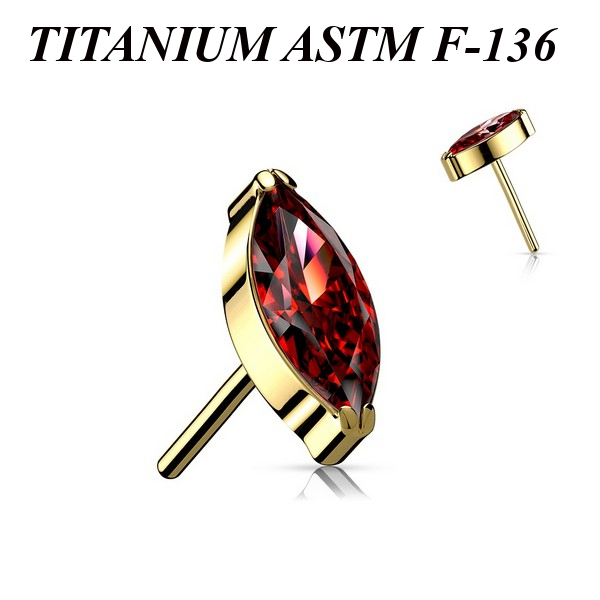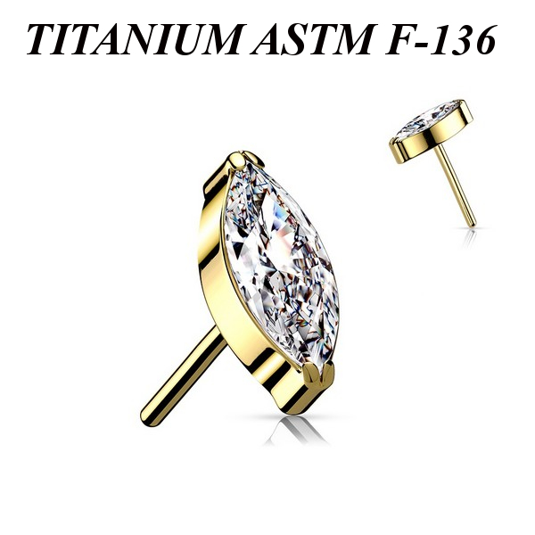 Вставка для безрезьбовых украшений из имплантационного титана 6Al-4V-Eli ASTM: F-136 с золотым PVD покрытием. Украшена фианитом огранки "маркиз".