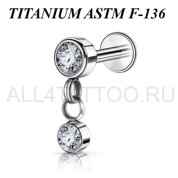Лабрет из имплантационного титана 6Al-4V-Eli ASTM: F-136 с внутренней резьбой. Украшен накруткой с прозрачными фианитами и дополнительной подвеской. Размер декоративной части: 4х11мм.