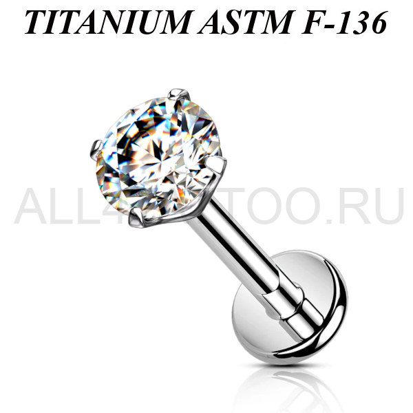Лабрет с внутренней резьбой из имплантационного титана 6Al-4V-Eli ASTM: F-136 с прозрачным фианитом в лапках.
