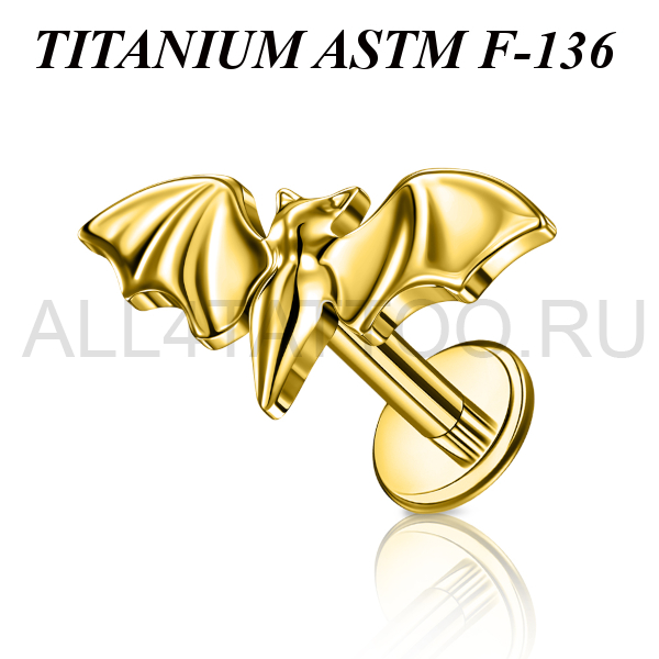 Лабрет с внутренней резьбой из имплантационного титана 6Al-4V-Eli ASTM: F-136 с накруткой в форме летучей мыши. Представлен в двух вариантах: классический титановый и с золотым PVD покрытием. Размер накрутки: 12х6мм.