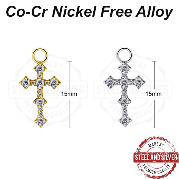 Подвеска из сплава кобальт-хрома, без содержания никеля размером 10х15мм. Украшена сетом кристаллов 1-2мм Premium Zirconia. Подходит для колец толщиной не более 1,6мм. Представлены в двух вариантах: классического стального цвета и с 18-ти каратным золотым PVD покрытием.