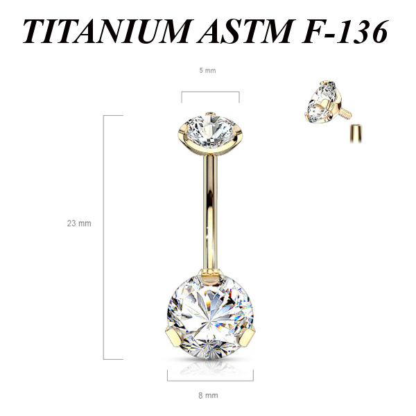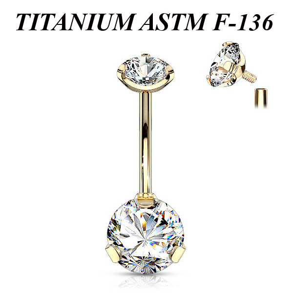 Банан из имплантационного титана 6Al-4V-Eli ASTM: F-136 с золотым PVD покрытием. Внутренняя резьба. Украшен фианитами. Диаметр нижнего кристалла - 8мм, верхнего - 5мм.