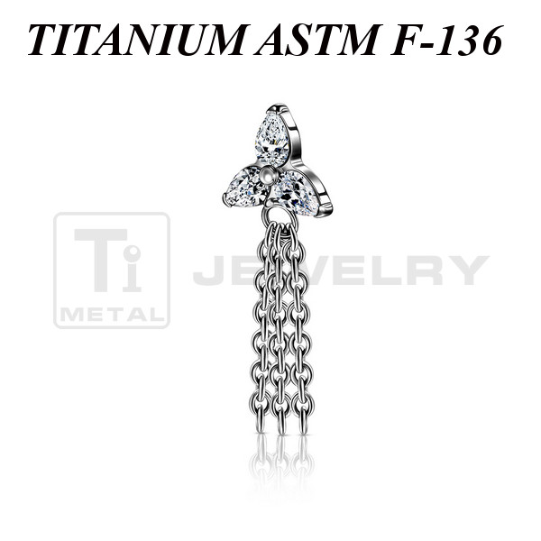 Накрутка из имплантационного титана 6Al-4V-Eli ASTM: F-136 с внутренней резьбой. Украшена прозрачными фианитами и декоративными цепочками. Размер накрутки с учётом цепочек: 18х6,5мм.
