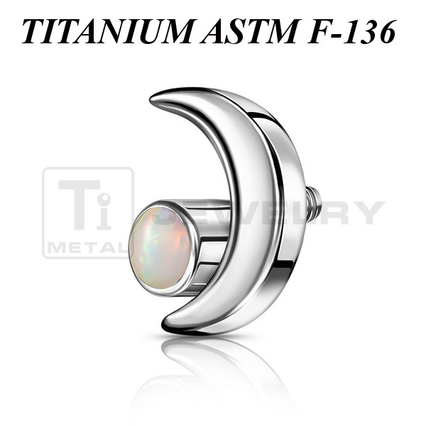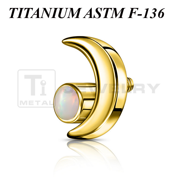 Накрутка из имплантационного титана 6Al-4V-Eli ASTM: F-136. Представлена в двух вариантах: классическая титановая и с золотым PVD покрытием. Выполнена в форме полумесяца, украшенного синтетическим опалом. Размер накрутки: 6х4мм. Подходит для украшений с внутренней резьбой толщиной 1 и 1,2мм.