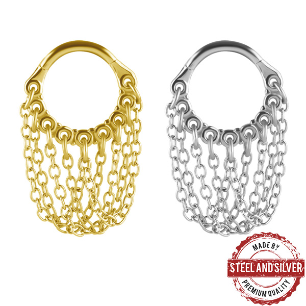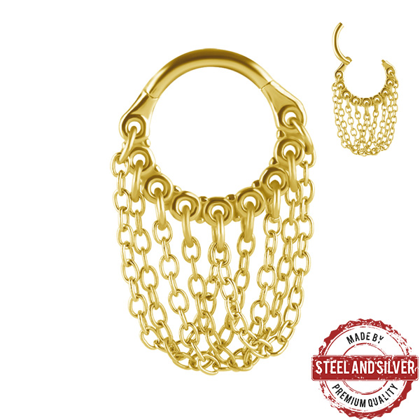 Кликер из хирургической стали 316L. Представлен в двух вариантах: классический стальной и с золотым 24х каратным PVD покрытием. Украшен тонкими цепочками.