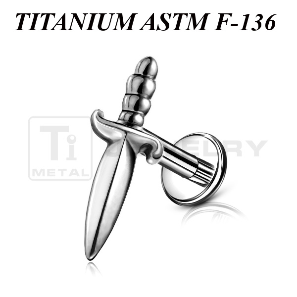 Лабрет из имплантационного титана 6Al-4V-Eli ASTM: F-136 с внутренней резьбой. Украшен фигурной накруткой размером: 3,9х10,2мм.