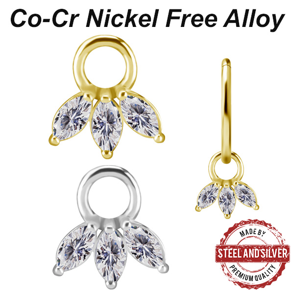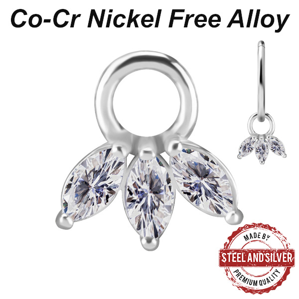 Подвеска из сплава кобальт-хрома, без содержания никеля. Украшена кристаллами Premium Cubic Zirconia. Подходит для колец толщиной не более 1,6мм. Размер: 6,2х6,5мм. Представлен так же вариант с 18-ти каратным золотым PVD покрытием.