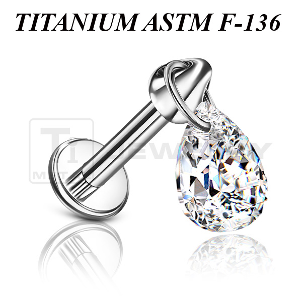 Лабрет с внутренней резьбой из имплантационного титана 6Al-4V-Eli ASTM: F-136 с накруткой в виде пики и подвеской из фианита в форме капли.